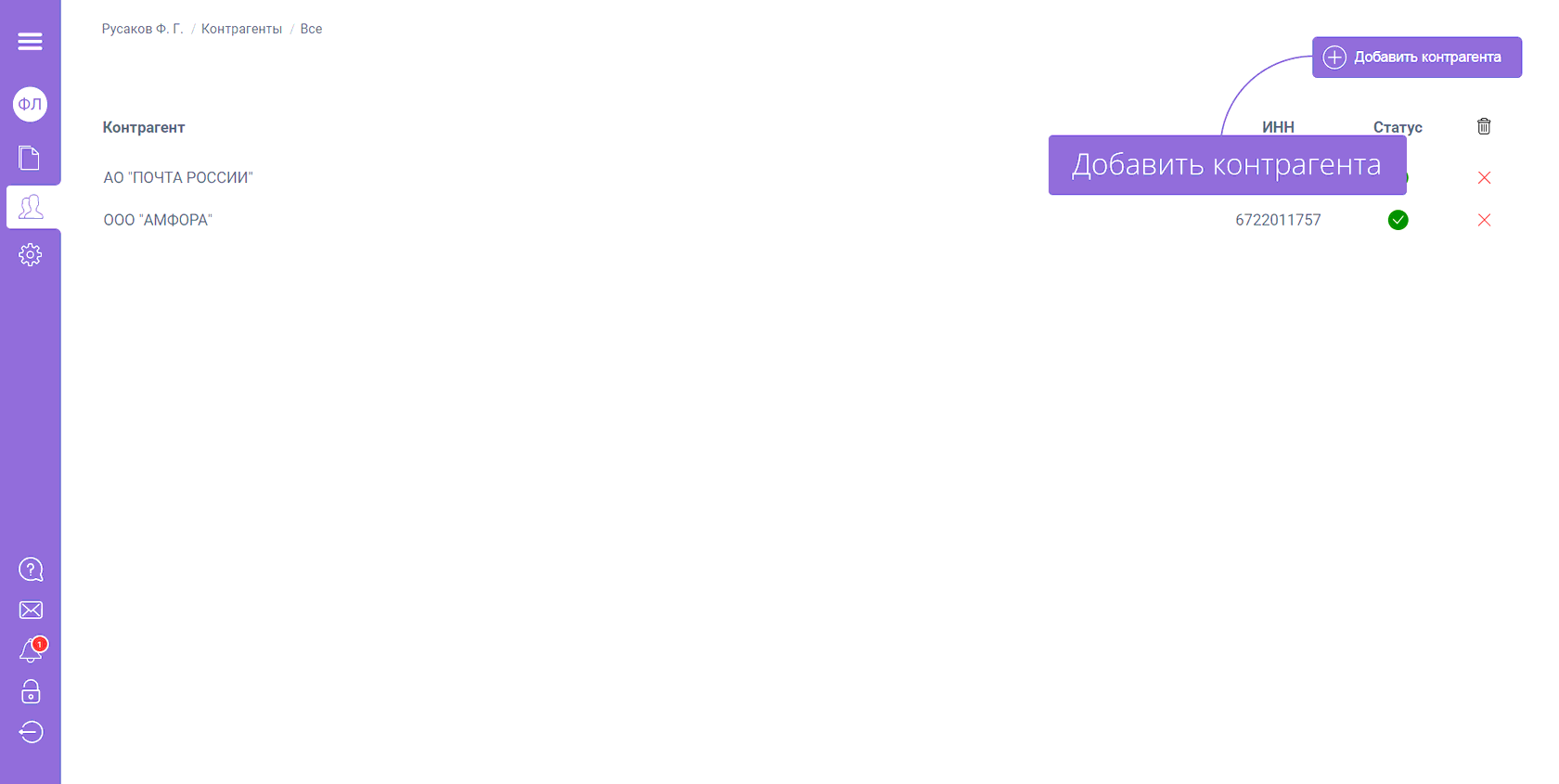 Перейдите в раздел «Контрагенты» и убедитесь, что Ваш работодатель есть в списке. Если юридическое лицо отсутствует, то Вы можете добавить его самостоятельно (добавление контрагентов более подробно описано в отдельном разделе руководства пользователя)
