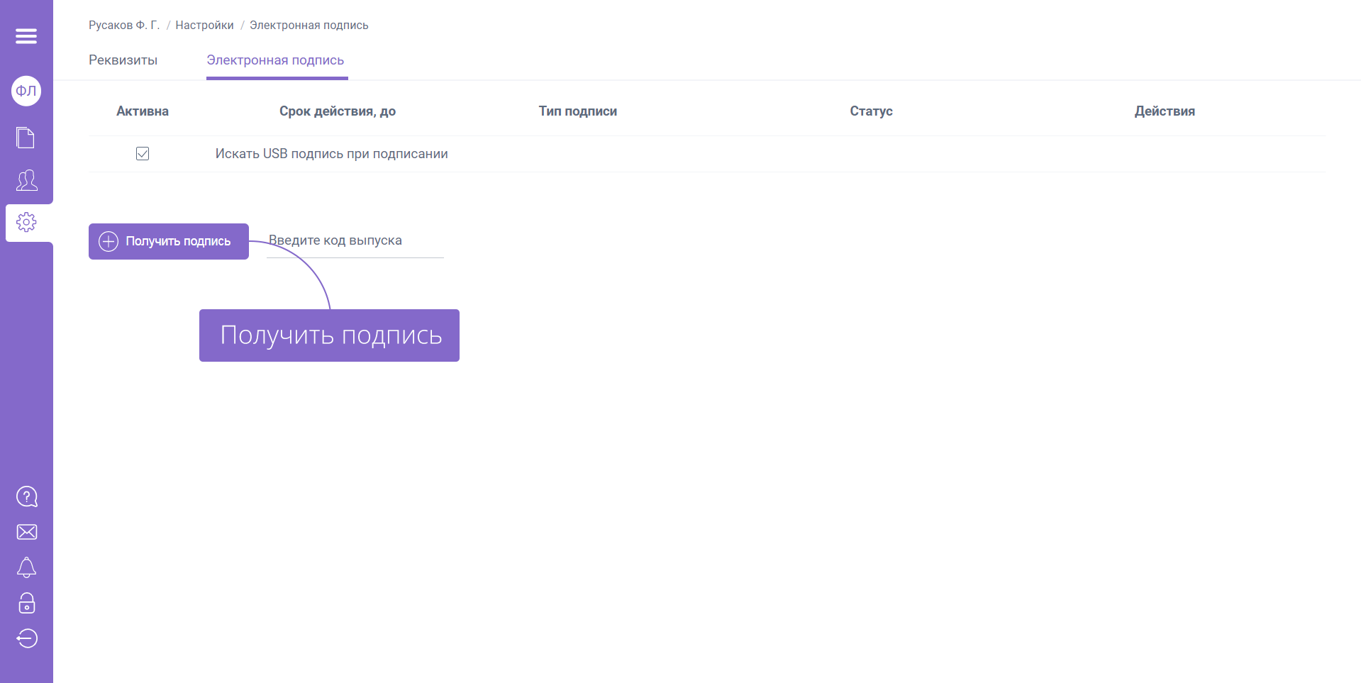 В разделе «Настройки» / «Электронная подпись» введите код выпуска «ПЭП» и нажмите «Получить подпись»