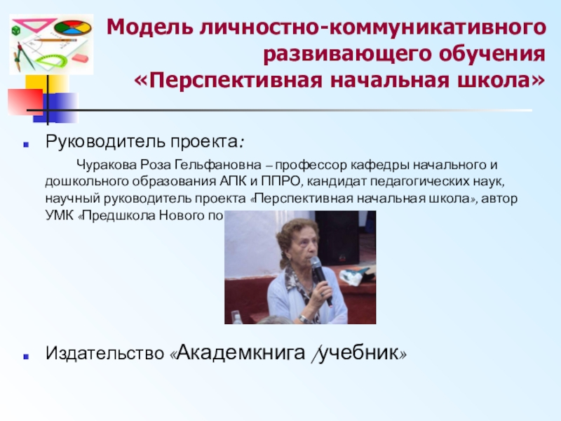 Чуракова Роза Гельфановна – профессор кафедры начального и дошкольного образования АПК и ППРО, кандидат педагогических наук, научный руководитель проекта «Перспективная начальная школа», автор УМК «Предшкола Нового поколения»);
