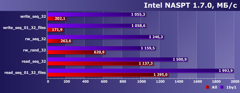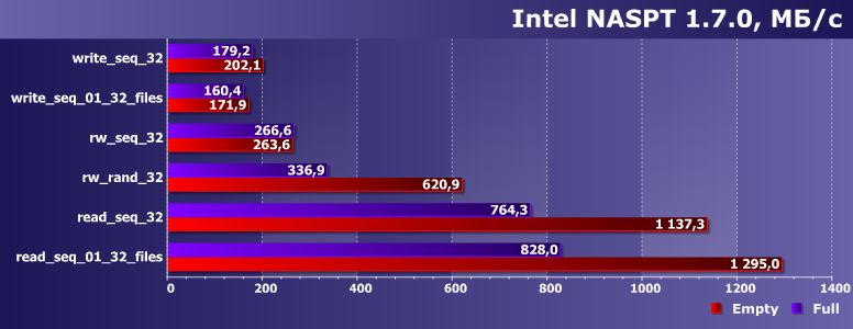 Тут на помощь приходит старый добрый NASPT. Картинка чуть отличается от более ранней – поскольку это другая платформа и, главное, немного другое программное обеспечение. Но это детали. А вот значима логика работы программы и способ ее использования: сначала она записывает файлы, которые будет читать любым способом или писать с произвольной адресацией, а потом уже идут сами тесты.