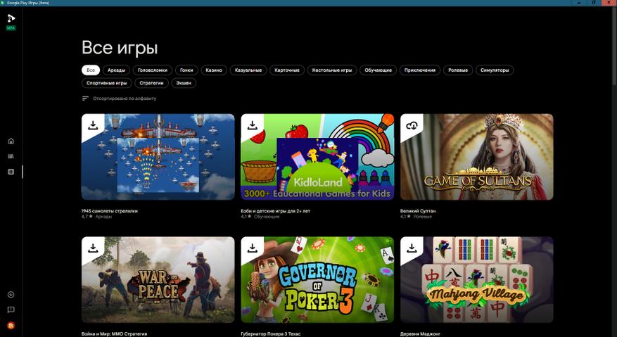Бета-версия Google Play Games представляет собой эмулятор с поддержкой клавиатуры и мыши, с помощью которого можно скачивать и запускать на ПК игры из Google Play, но далеко не любые. В данный момент в перечне доступных к установке игр находится всего 142 наименования. Впрочем, среди них довольно много известных тайтлов, таких как Asphalt 9 или Warspear Online, хотя в случае последней не до конца ясен смысл запуска игры в эмуляторе, ведь в Steam уже давно доступна версия Warspear Online для Windows.