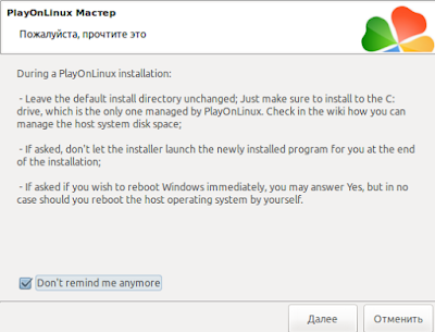 Точнее нужно дождаться того момента когда в PlayOnLinux спросят насчет ярлыка. Надо выбрать «Я не хочу создавать другой ярлык» и нажать «Далее». После этого окна PlayOn Linux можно закрывать.