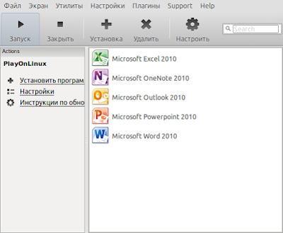 После завершени установки вы увидите значки программ Office 2010 в главном окне PlayOnlinux.