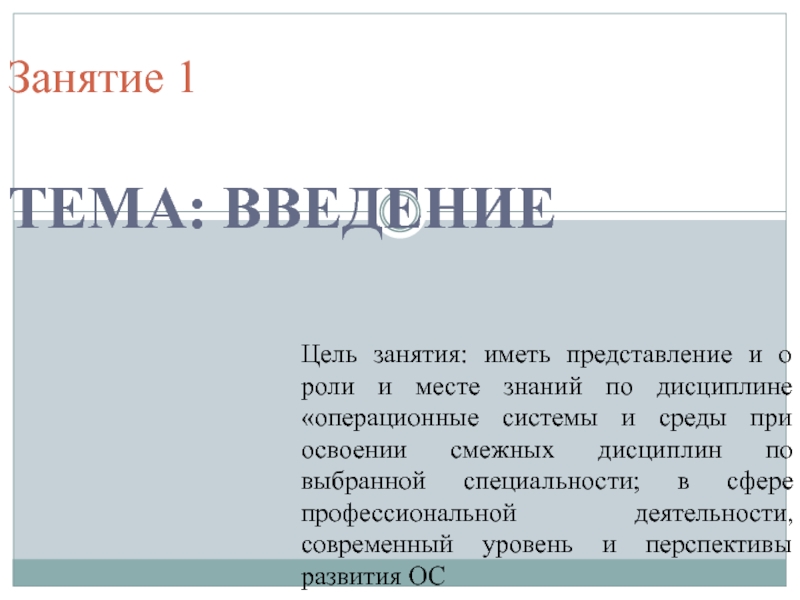ТЕМА: ВВЕДЕНИЕЗанятие 1Цель занятия: иметь представление и о роли и месте знаний по дисциплине «операционные системы и среды при освоении смежных дисциплин по выбранной специальности; в сфере профессиональной деятельности, современный уровень и перспективы развития ОС