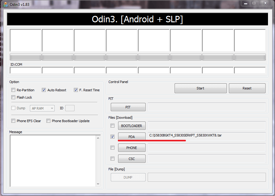 Включаем программу Odin. В поле AP или PDA помещаем скачанный файл прошивки.