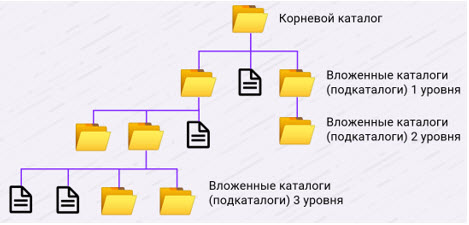 Каталог, который не имеет внешних каталогов, называется корневым. В корневой папке содержатся вложенные каталоги первого уровня, которые также могут содержать вложенные каталоги второго уровня и так далее. В каталогах всех уровней могут храниться файлы.