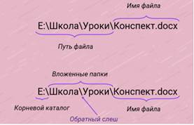Путь к файлу начинается с названия корневого каталога устройства внешней памяти или тома жёсткого диска. Затем записываются названия всех папок, в которых находится файл от высшего уровня к низшему. В Windows названия каталогов разделяются символом «обратный слэш».