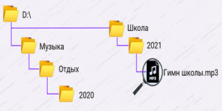 И так мы нашли путь к файлу, который запустил Алёша. Имя файла «Гимн школы.mp3». Записав последовательно путь к файлу и имя файла, получим полное имя файла «D: Музыка Школа2021 Гимн школы.mp3».
