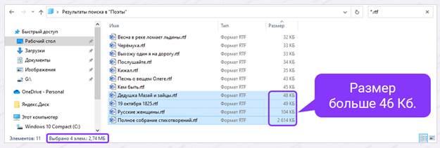 Переходим в папку «Поэты». В поле поиска вводим звёздочка .rtf. В данном задании необходимо, чтобы файлы выводились в виде таблицы. Теперь сортируем размер фалов по возрастанию или убыванию, нажимая на заголовок колонки «Размер». Выделяем файлы, у которых размер больше 46 килобайт, и в строке состояния видим их количество – 4 элемента.