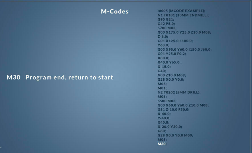 Являясь дополнением G-кодов, M-коды ЧПУ управляют вспомогательными функциями станка, такими как подача СОЖ и управление шпинделем. Далее поговорим об основных M-кодах.