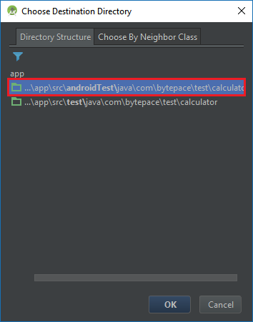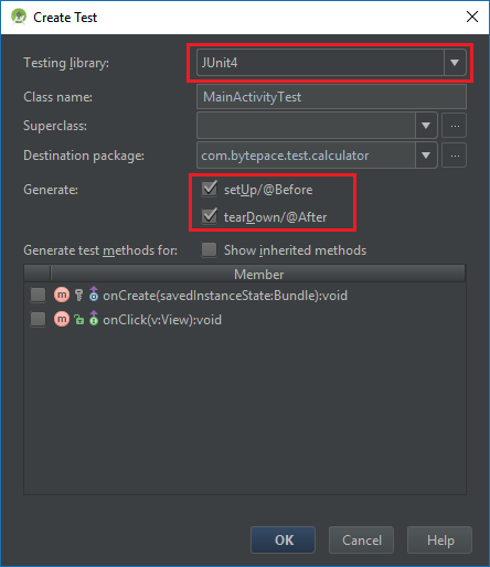 Выберем библиотеку для тестирования JUnit 4. Ставим галочки напротив setUp и tearDown. Данные методы являются методами жизненного цикла теста. После чего жмём кнопку «OK». Здесь мы выбираем директорию с наименованием «androidTest».