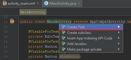 Для этого добавим следующий фрагмент кода в класс MainActivityTest.java.