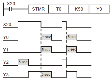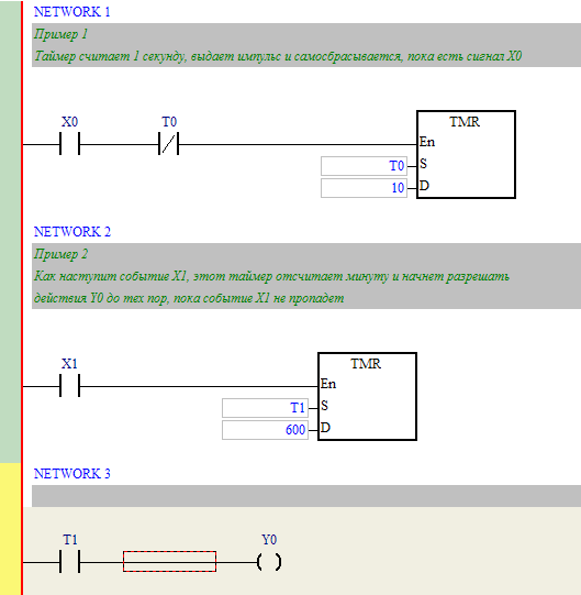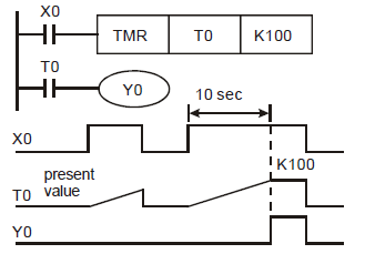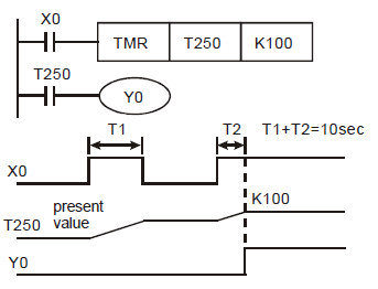 Таймеры Delta Electronics отличаются от Omron в том, что их применение заранее определно номером используемого регистра. Все они считают от 0 до уставки и только в десятичном формате. 32-битные инструкции займут два регистра [T0,T1], [T2,T3].