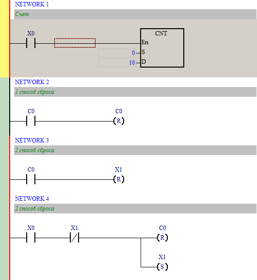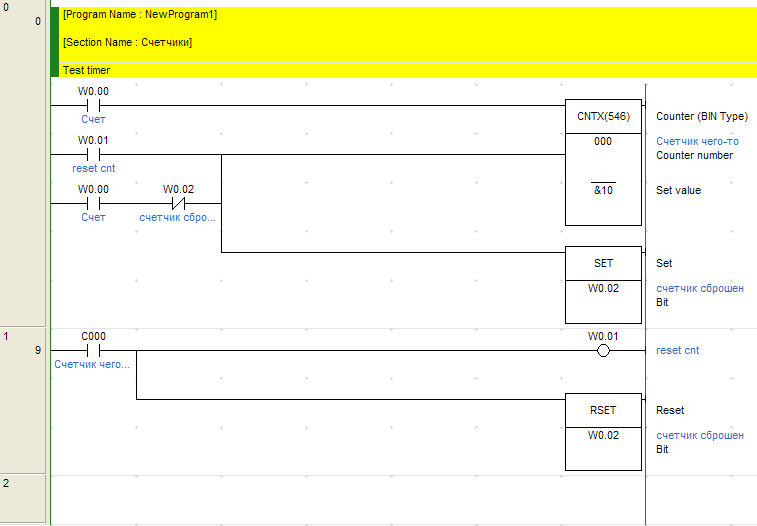 В данном примере я объединил два способа сброса. По первому (с использованием W0.01, но вместо него можно на вход сброса поставить и бит C0 (флаг окончания счета)), досчитав, счетчик будет выдавать импульс на С0 и самосбрасываться. В этом способе, необходимо до первого счета уже обнулить счетчик. По второму, с использованием W0.02, остальной программе достаточно подавать счет на W0.00, первый сброс будет самостоятельным.
