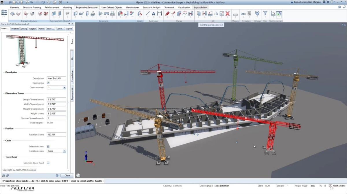 В связи с последними тенденциями Allplan всё больше старается учитывать процесс строительства на этапах проектирования и первоначальной подготовки строительства объектов, поэтому для оборудования стройплощадки предлагается библиотека таких объектов, как краны, насосы, опалубки и другие.
