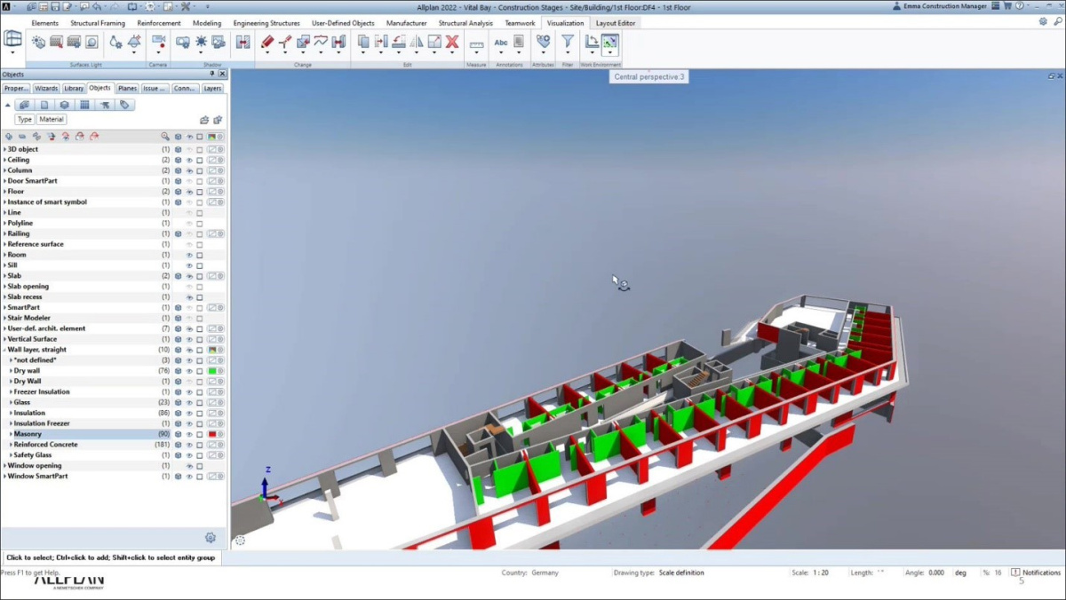 В Allplan 2022 появилась возможность быстрого обнаружения ошибок, например, неназначенные или неправильно назначенные атрибуты легко выявить благодаря цветной кодировке. Так, новая функция значительно облегчает проверку модели.