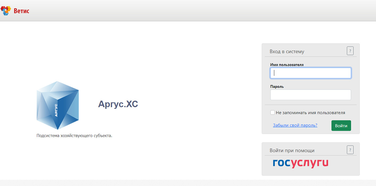 После регистрации в Аргус (как и в случае с ФГИС Меркурий), вход в подсистему, используемую для работы, осуществляются с помощью реквизитов доступа (логина и пароля), которые вводятся в форме авторизации. Каждый отдельный пользователь, работающий в системе Аргус, связан со своим предприятием. Поэтому у него имеется доступ к той подсистеме, которая используется его учреждением. К примеру, сотрудник ветеринарного управления не войдет в подсистему территориального управления, и наоборот.