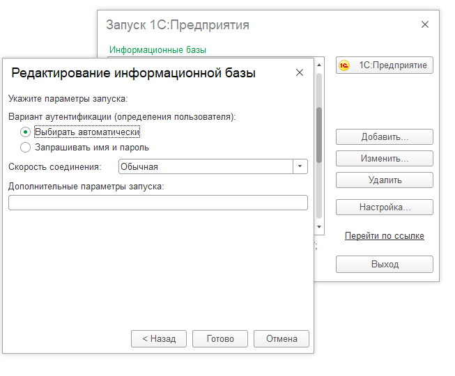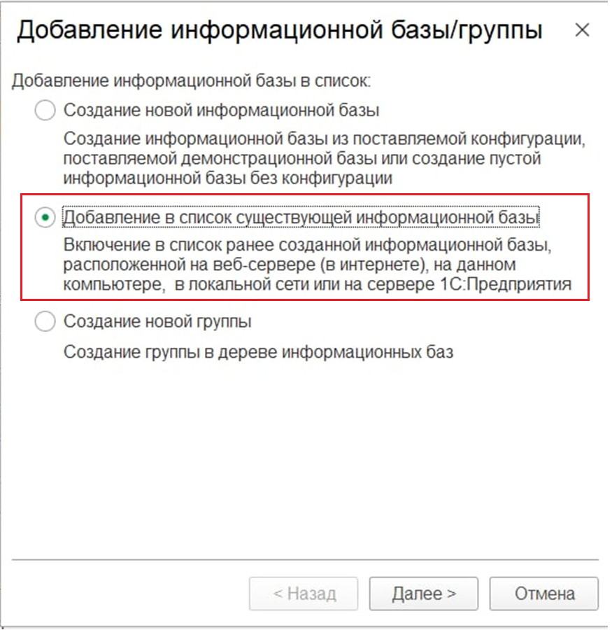 Если 1с ранее не была установлена, то откроется окно «Добавление информационной базы», в нем необходимо выбрать параметр » Добавление в список существующей информационной базы «
