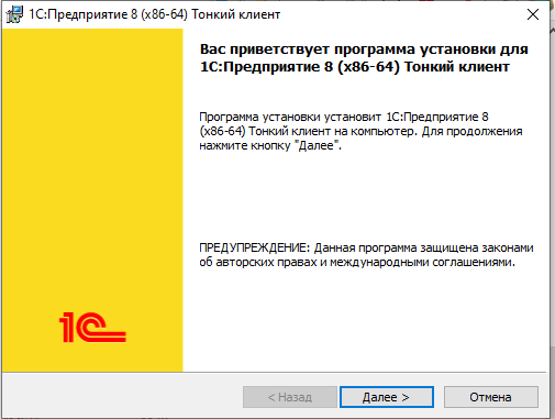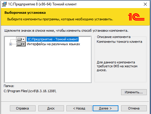 В следующем окне выберите папку, куда установится 1С. По умолчанию программа устанавливается в папку C:Program Files1cv88.3.18.1208. Нажмите кнопку «Далее».
