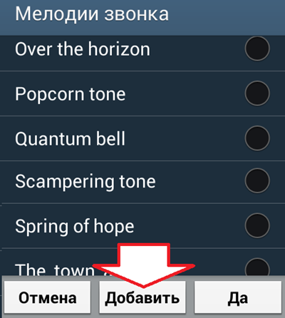 В результате откроеся меню со стандартными рингтонам. Если вам подходит один из стандартных рингтонов, то можете просто его выбрать и нажать на кнопку «Да». Если же вы хотите установить собственный не стандартный рингтон, то вам нужно нажать на кнопку «Добавить».