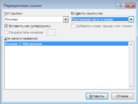 «Для какого названия» — «Рисунок 1» (то есть тот рисунок, на который требуется создать ссылку).