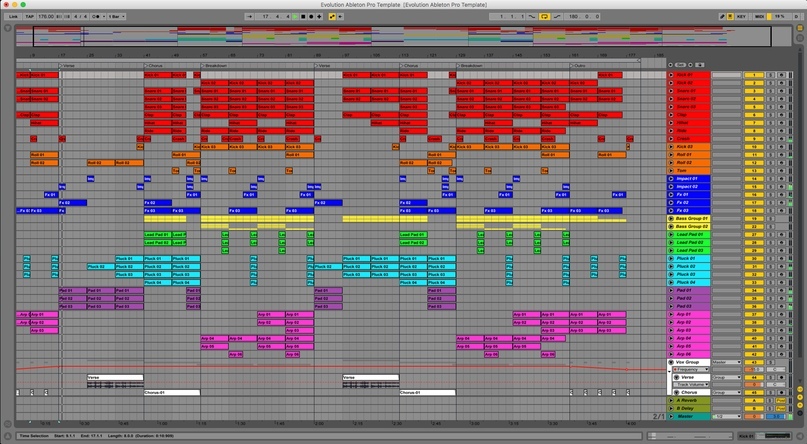 - Можно создать «образцовые» пустые дорожки, которые вы будете дублировать по мере необходимости, либо начать с большого количества уже созданных моно и стерео треков с цветовым кодированием.