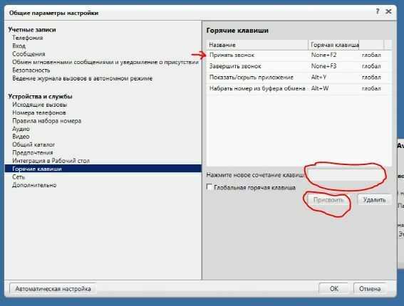 В разделе «Горячие клавиши» назначить на принятие и завершение звонка клавиши F2 и F3: выбрать пункт справа «Принять звонок», нажать F2 (в поле «Нажмите новое сочетание клавиш» появится ваш выбор), нажать «Присвоить». Далее аналогично пункт «Завершить звонок», F3, «Присвоить».
