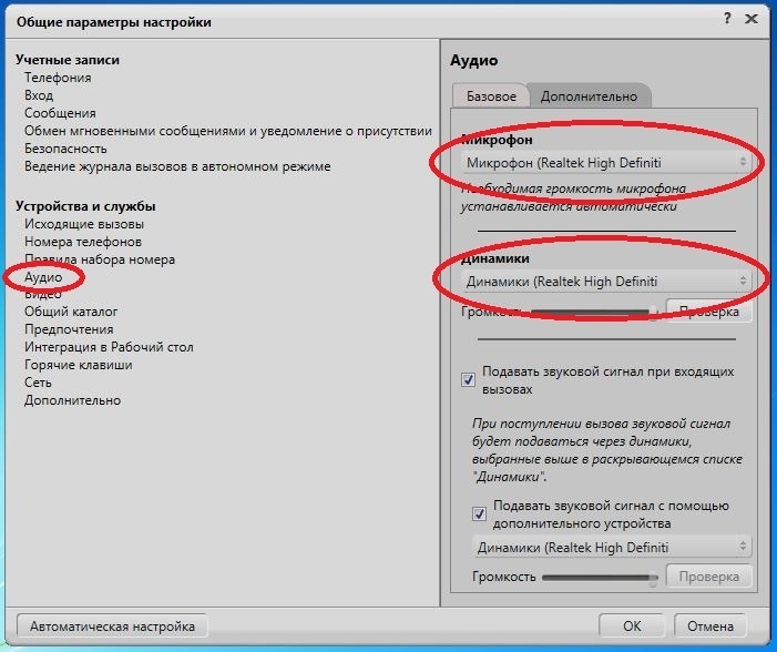 Проверка правильного определения ваших наушников и микрофона в программе AWAYA Communicator: