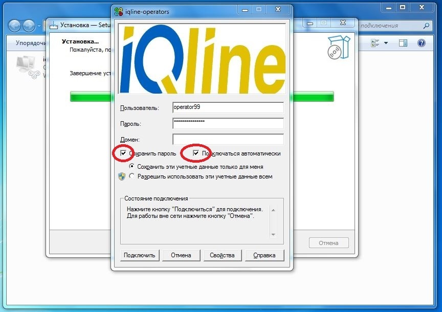 В поля «Пользователь» и «Пароль» ввести персональный логин и пароль полученные от сотрудника iQline. Поле «Домен» заполнять не нужно.