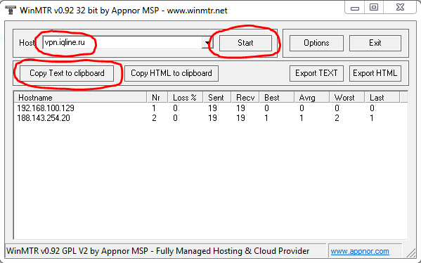 В поле Host ввести vpn.iqline.ru и нажать Start ,