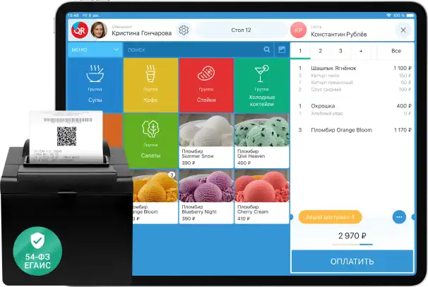 Облачный продукт от компании «СБИС», занимающейся электронным документооборотом. Главное преимущество — это возможность подгрузки приходных накладных через «ЭДО СБИС». Есть свой оператор фискальных данных, который можно использовать для передачи их в налоговую. Интерфейс кассира яркий, но классический — по сути выбор клавиш с нужными блюдами из списка. Есть модули для поваров, виджет «Мобильный официант», модуль доставки, CRM.