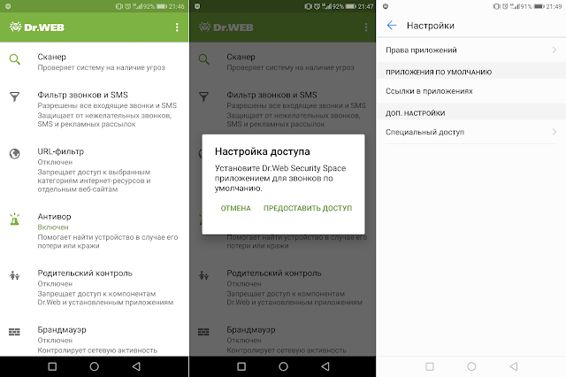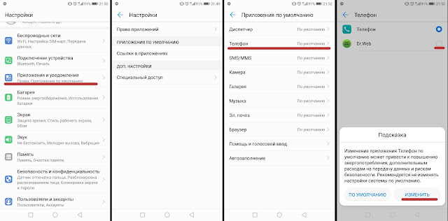Меняем приложение по умолчанию телефон, на Dr.Web (в моей версии просит подтверждения)