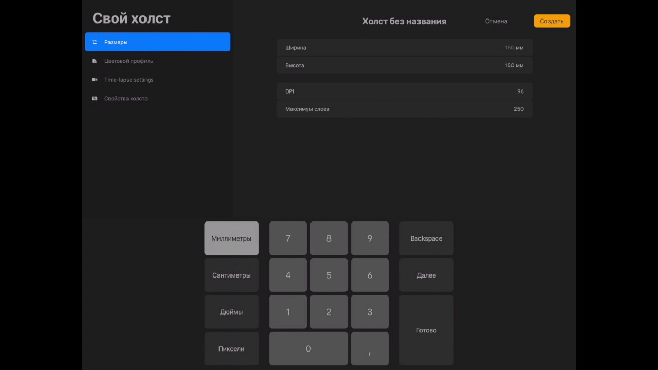 Создать холст в программе. Для этого необходимо кликнуть по иконке “+” в правом верхнем углу. Программа позволяет выбирать размер холста и качество изображения. Количество пикселей и размер холста влияют на то, сколько слоев в последующем можно будет нанести.