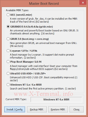 Выбрать записываемый загрузчик можно в секции Available MBR Types, путем выставления переключателя на соответствующий загрузчик, и последующего нажатия кнопки Install / Config.