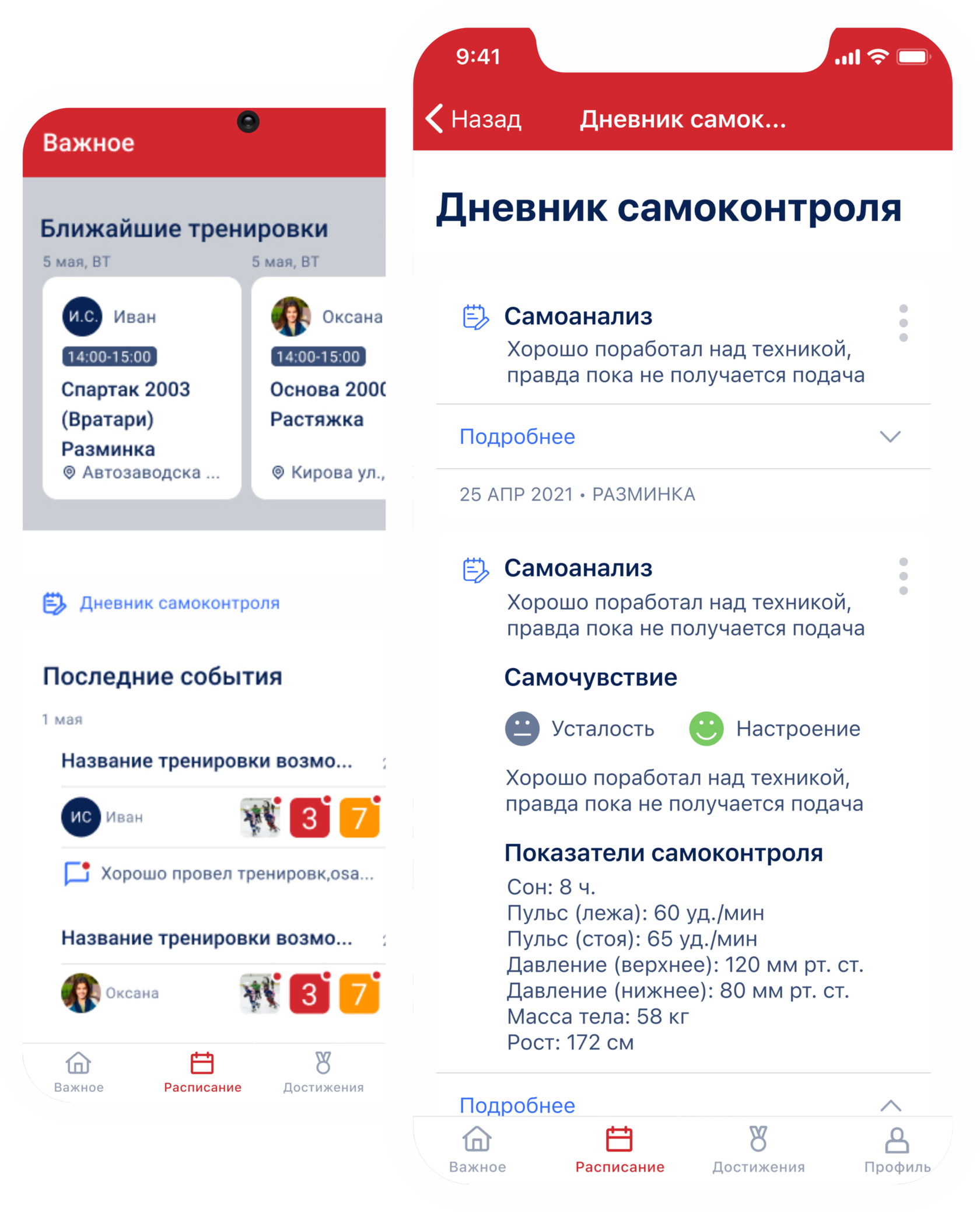 В приложении можно: смотреть расписание занятий, результаты тренировок и соревнований, комментарии от тренера, фото и видео с тренировок.