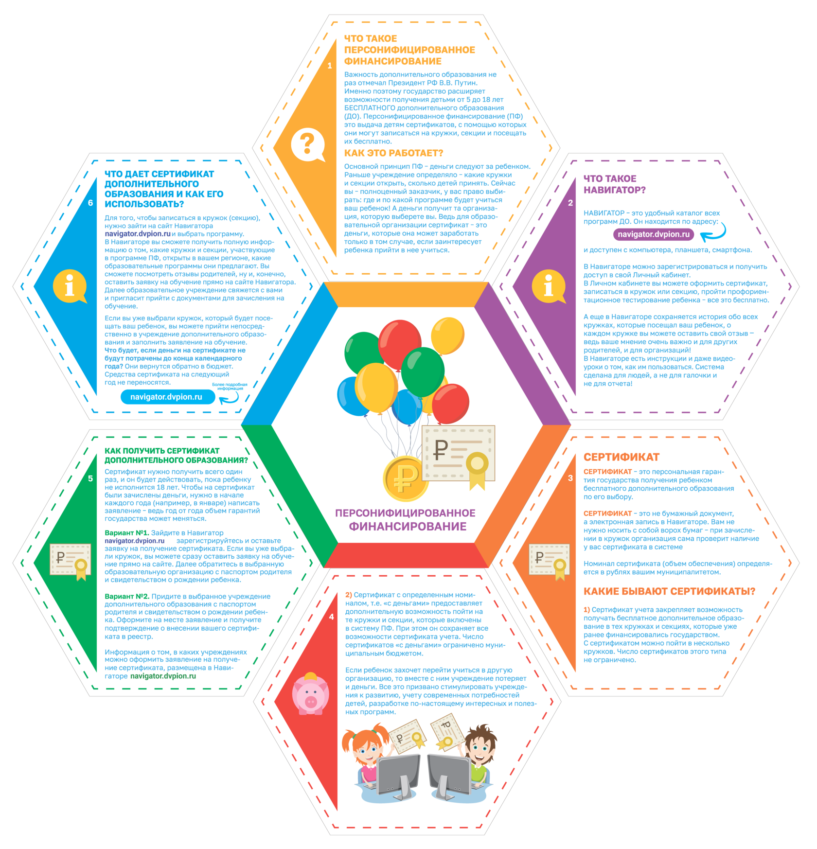 На единой федеральной платформе создан общедоступный сайт-навигатор по дополнительным общеобразовательным программам. Навигатор рассчитан на родителей и детей, содержит сведения обо всех аккредитованных программах дополнительного образования. Также через навигатор можно оформить сертификат на дополнительное образование для каждого ребенка с 5 до 18 лет.