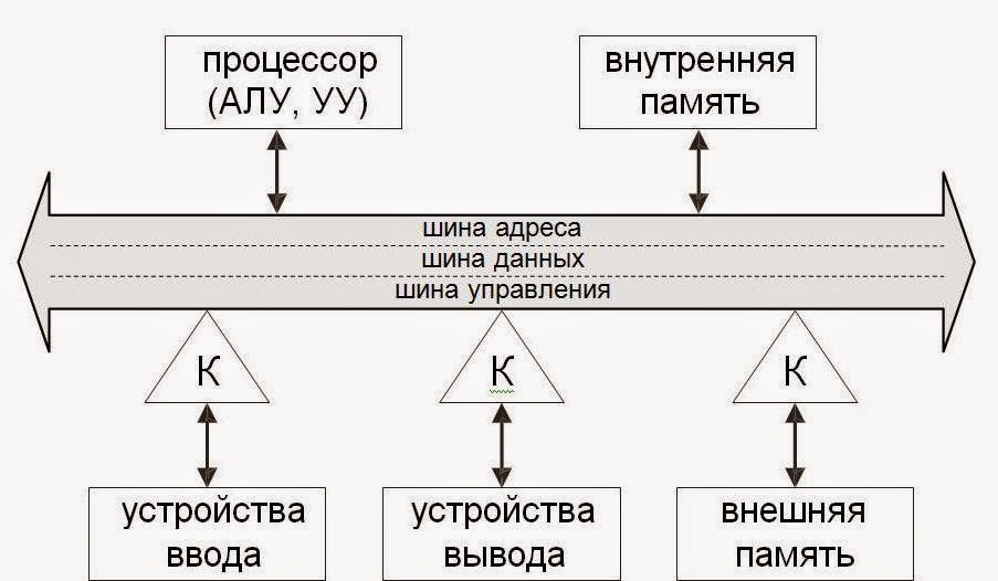 По сравнению с первыми ЭВМ, взаимодействие процессора с внешними устройствами организуется теперь по-другому. В классической архитектуре процессор контролировал все процессы ввода-вывода. Получалось так, что быстродействующий процессор тратил много времени на ожидание при работе с значительно более медленными внешними устройствами. Поэтому появились специальные электронные схемы, которые руководят обменом информацией между процессором и внешними устройствами. В третьем поколении такие устройства назывались каналами ввода-вывода, а в четвертом – контроллерами (на схеме они обозначены буквой К).