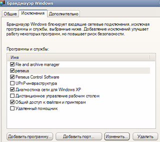 Нажимаем кнопочку исключения. Там у вас по умолчанию станет только программа — Perseus Software Center. В свойствах будет прописан путь к программе Perseus. Вам надо будет ручками добавить порт, назовём его perseus, и обозначим в нем протокол UDP и порт 0814. Можно, конечно, его поменять потом, если ваш любимый SDR приёмник использует другой порт.