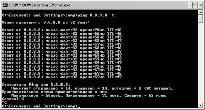 Ping – t позволяет отправлять ICMP запросы (пинговать) бесконечно долго, пока вы сами не прекратите этот процесс путем нажатия Ctrl + C . Иногда бывает очень удобно пинговать какую либо железку с параметром – t во время ее настройки, для того чтобы наблюдать как она себя поведет при изменении конфигурации.