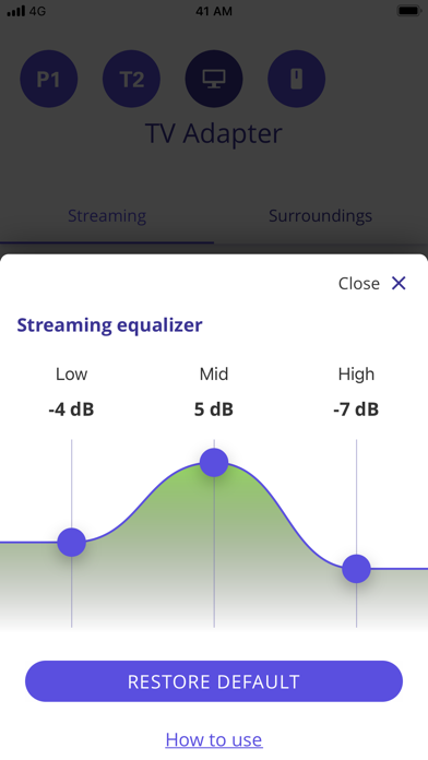 — Точная настройка звука при просмотре фильма или потокового аудио с помощью потокового эквалайзера для персонализированного прослушивания. Эквалайзер потоковой передачи может быть недоступен для некоторых старых слуховых аппаратов Bluetooth.