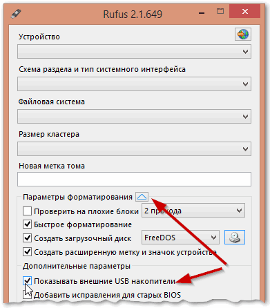 После запуска утилиты и подключения внешнего USB диска, скорее всего, вы ничего не увидите. По умолчанию Rufus не видит внешние USB диски, если вы специально не поставите галочку в дополнительных параметрах (см. рис. 1).