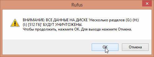 Rufus перед записью предупредит вас о том, что все данные будут удалены — будьте внимательны: многие пользователи ошибаются с буквой диска и форматируют не тот диск, который хотели (см. рис. ).