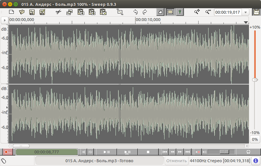 Звуковой редактор Sweep поддерживает все основные операции по редактированию аудиофайлов (такие как удаление, копирование, вставка и пр. ), звуковые эффекты в редакторе реализованы в виде LADSPA плагинов.