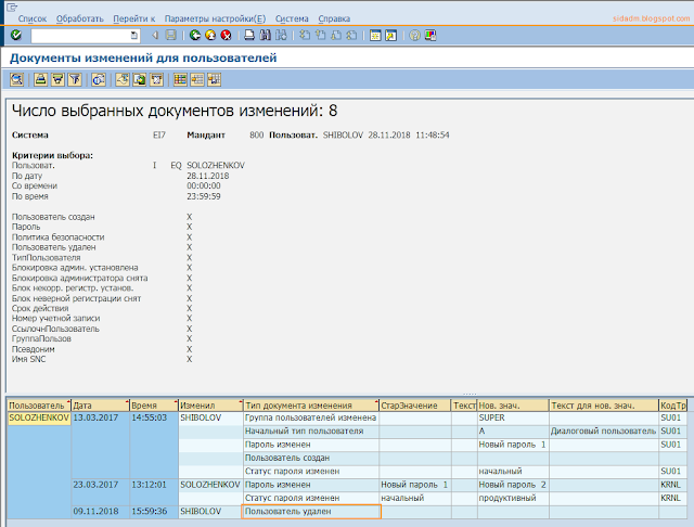 Один интересный момент — если пользователь был удален из системы, то данный журнал изменений в системе всё равно хранится (обратите внимание на последнюю запись в отчете на рис. 8).