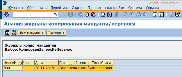 | Рис. 3. Журнал переноса запроса между мандантами одной системы. |