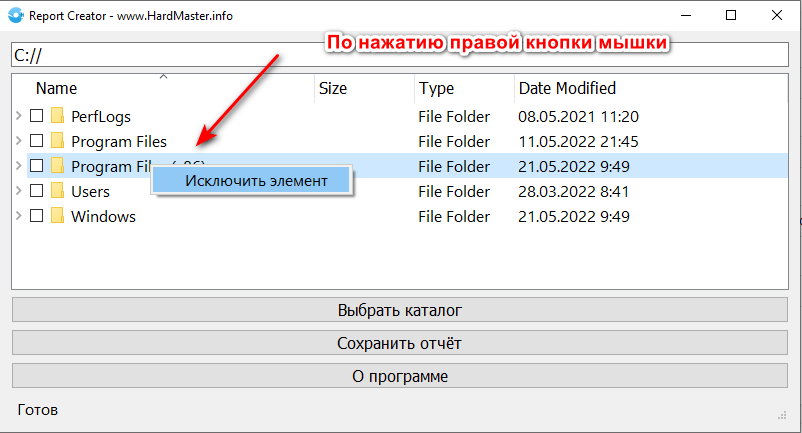 Утилита позволяет исключать отдельные файлы или папки на этапе подготовки к формированию отчёта с целью кастомизации итогового результата.