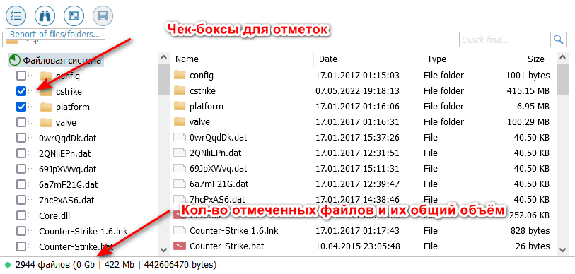 В сформированном отчёте доступна опция выбора файлов и папок путём проставления отметок в чек-боксах с выводом информации о количестве отмеченных файлов и их объёме.