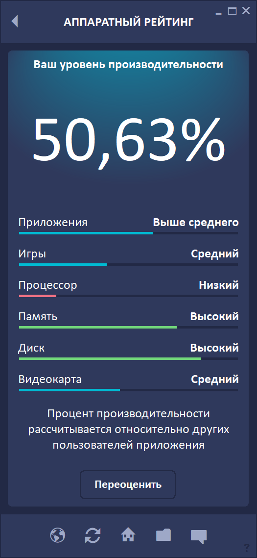 Приложение всегда наглядно подскажет насколько ваш компьютер быстрее, чем у других пользователей. И не в абстрактных «баллах», а вполне конкретно, например, сейчас ваш компьютер быстрее чем у 99,79% пользователей.