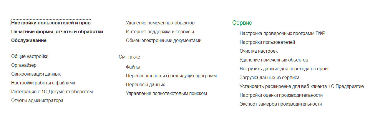 Раздел «Администрирование» — это рабочее место администратора системы. Содержит инструменты для разграничения прав доступа. Подключения Интернет-поддержки и сервисов 1С.