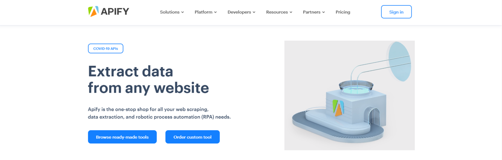 Apify SDK — это масштабируемая библиотека для сканирования и просмотра веб-страниц на Javascript. Позволяет обрабатывать данные и полностью автоматизировать работу по сбору данных. Есть несколько тарифных планов, в том числе и бесплатный со своими ограничениями.